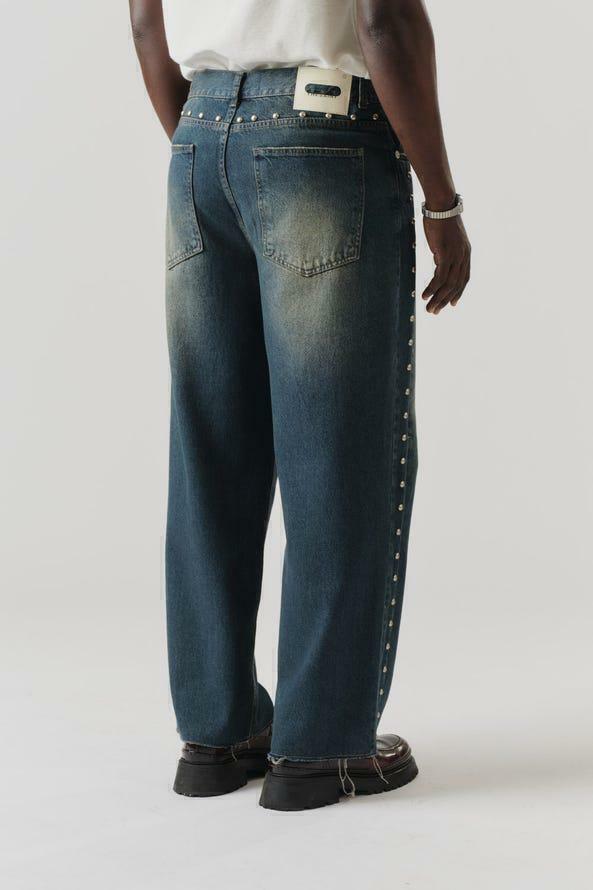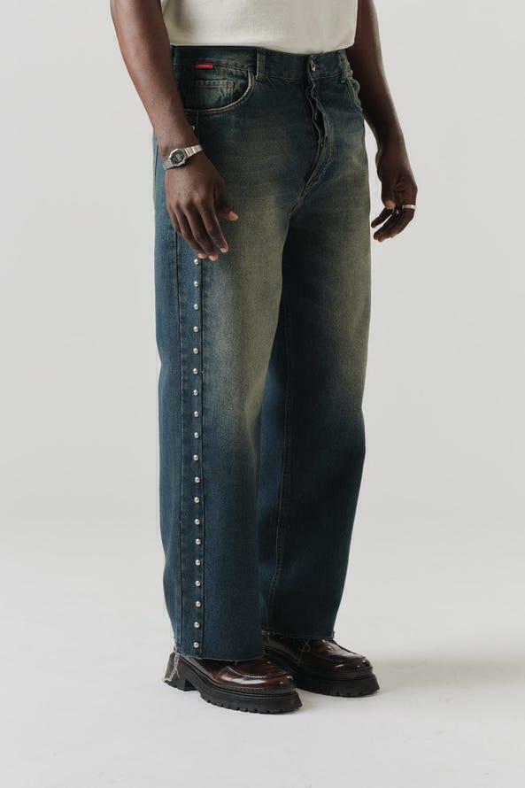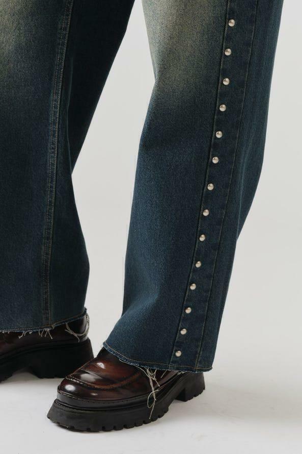 A Denim Pants Metallic Buttom apresenta corte wide leg, com pernas e caimento amplas. Possui ilhós metalizados ao longo da peça. Confeccionado em tecido premium 100% algodão.