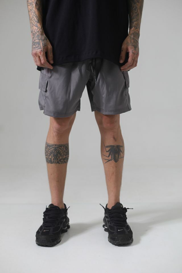 Shorts em tecido sarja com bolsos frontais fundos, bolsos traseiros, bolsos laterais cargo com fecho, cós com elástico e cordão de ajuste.